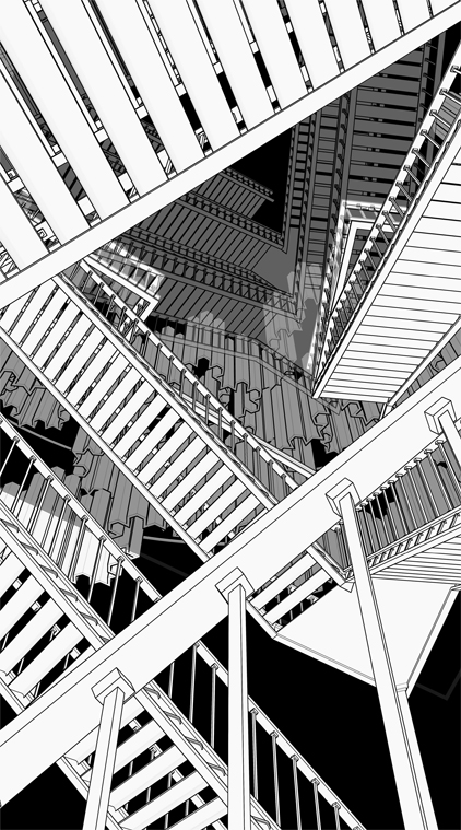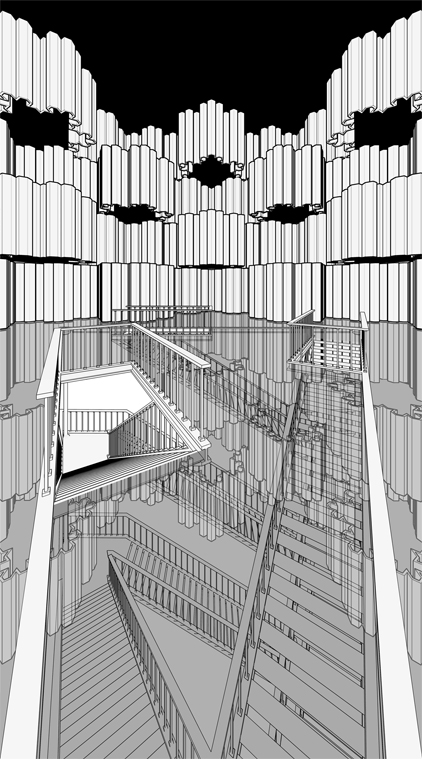 L'installation no2 est constituée d'une plateforme accessible par trois escaliers en colimaçon, pris dans une cage en forme de prisme. Au sommet de la plateforme se trouvent quatre étages constitués de panneaux pliants. Ils adoptent la topologie du flocon de Helge von Koch, projeté à la verticale : une fractale inventée par le scientifique allemand en 1906. Pour construire le flocon, il faut tracer un triangle équilatéral, diviser ses arêtes par trois, puis faire naître des segments médians de nouveaux triangles équilatéraux. Enfin enlever les arêtes intérieures. Chaque étage est décalé de 30° par rapport à celui sur lequel il est dressé.