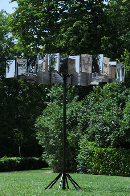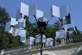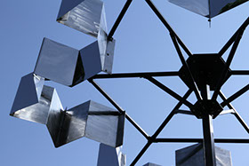 Flocon est une sculpture comprenant une couronne en inox poli miroir articulée au-dessus du sol par une structure en acier, composée de deux moyeux à six rayons, reliés par un axe vertical.