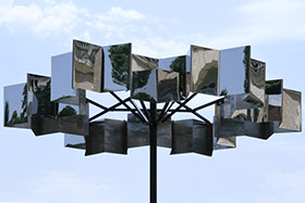 Flocon est une sculpture comprenant une couronne en inox poli miroir articulée au-dessus du sol par une structure en acier, composée de deux moyeux à six rayons, reliés par un axe vertical.