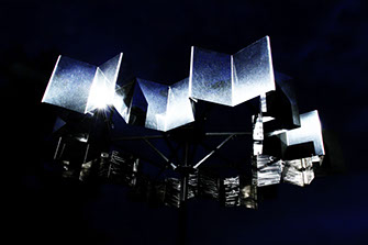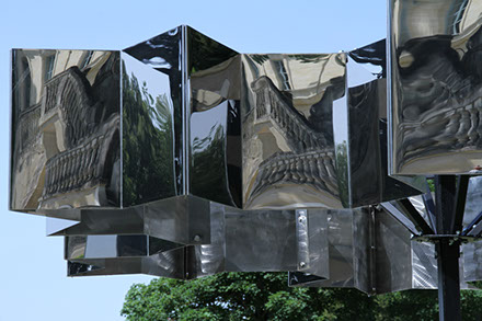 À hauteur des yeux, la couronne d'inox semble être constituée de panneaux disposés aléatoirement. L'aspect réfléchissant de l'inox poli miroir, en rendant notre appréciation de sa topologie plus difficile, renforce cette impression. Cependant, lorsqu'elle est éclairée par une source de lumière ponctuelle, l'ombre portée de la couronne révèle qu'elle est en réalité construite de manière très régulière : sa structure est même récursive.