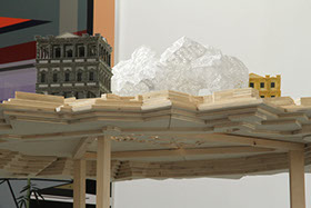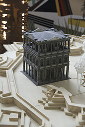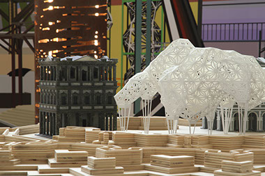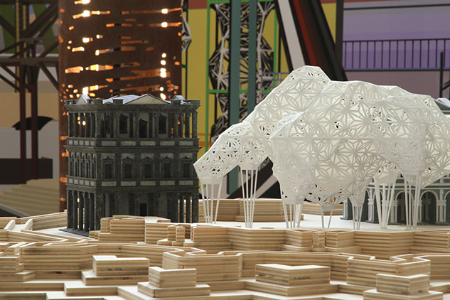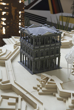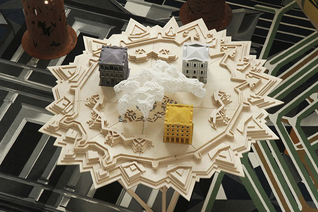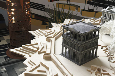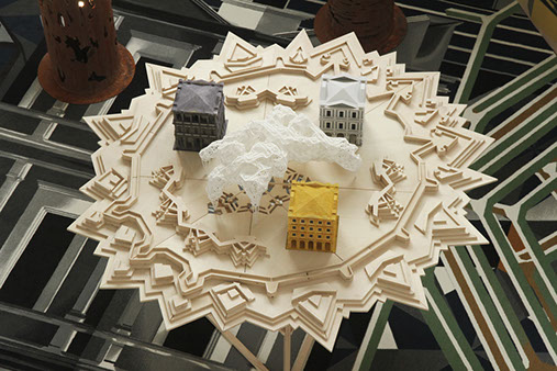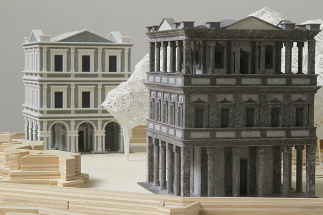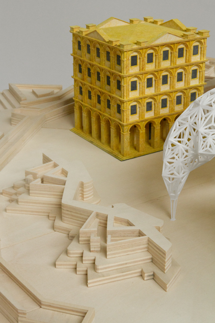 Une première partie d’Histopoi est composée par une maquette en contreplaqué de peuplier, découpée au jet d’eau, de fortification à l’italienne, typique du XVe siècle et de la Renaissance. Elle est surplombée par trois copies de bâtiments (frittés dans une poudre de gypse et de résine, puis teintés dans la masse grâce à une tête d’impression commandée par ordinateur) figurant dans la peinture de la Cité idéale d’Urbino attribuée à Piero della Francesca. Ces éléments rappellent les villes nouvelles construites à l’époque de la Renaissance, avec leur plan d’organisation rayonnant.