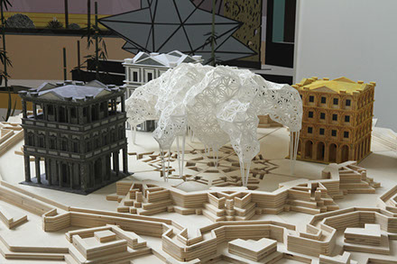 Ils entourent une structure complexe dont l’apparence rappelle celle d’un rhizome, également imprimé en 3D. Elle a été conçue par ordinateur grâce à la coalescence de meta-objects, des objets paramétriques qui furent beaucoup utilisés dans les années 1990 pour la simulation de fluides. Ces objets mathématiques ont bénéficié d’une fortune relative en architecture : ils permirent de développer aisément des structures autoportantes dont le dessin s’affranchissait des règles régissant la construction de bâtiments plus traditionnels. Les « blobitectures » et les architectures modulaires apparentées sont l’objet aujourd’hui d’un intérêt marqué en urbanisme.