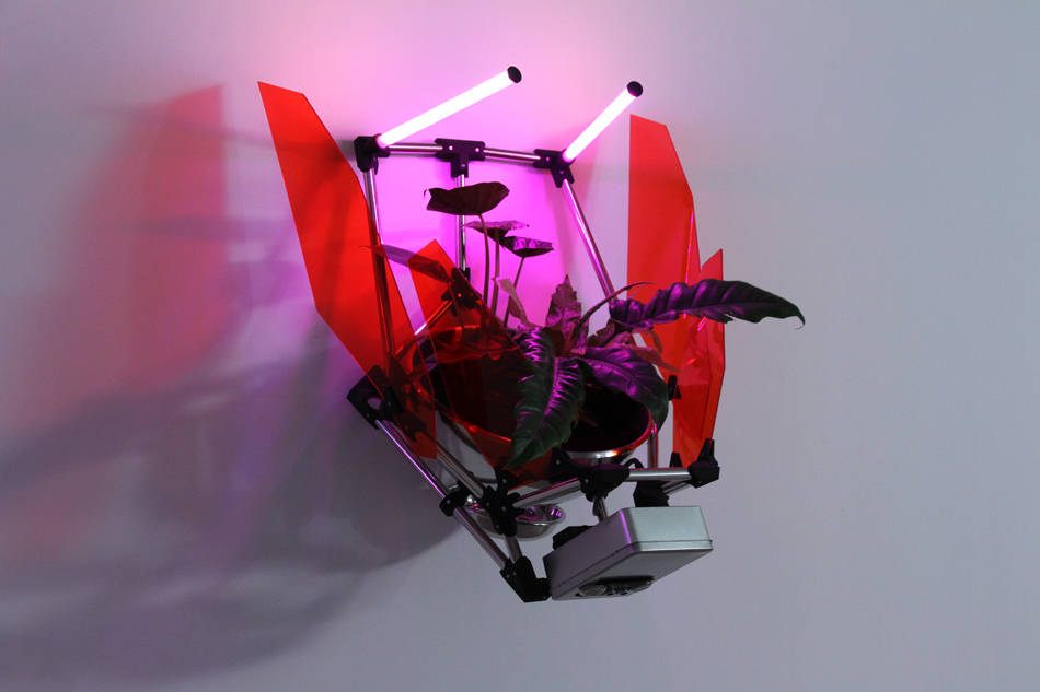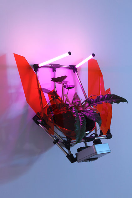 Dispositif interactif sonore et lumineux (comprenant un capteur à ultrasons, des LED programmables et horticoles, deux microcontrôleurs Arduino, deux microordinateurs Raspberry Pi et deux paires d’enceintes), tubes et demi-sphère en inox poli miroir, nœuds imprimés en 3D par frittage de poudre, plaques de PMMA, boîte en aluminium, billes d’argile, terre, végétaux (philodendron, calatheas) - fond : série Disparues et Chrysalide no1