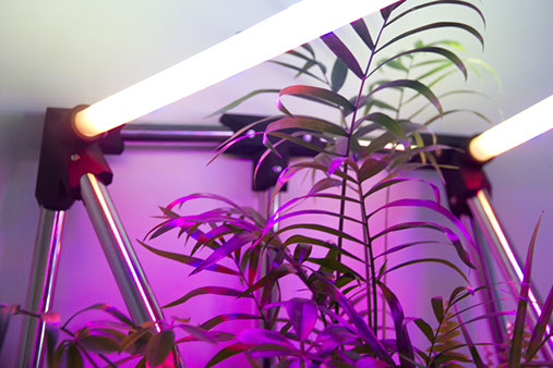 dispositif interactif sonore et lumineux (comprenant un capteur à ultrasons, des LED programmables et horticoles, un microcontrôleur Arduino, un microordinateur Raspberry Pi et une paire d’enceintes), tubes et demi-sphère en inox poli miroir, nœuds imprimés en 3D par frittage de poudre, plaques de PMMA, boîte en aluminium, billes d’argile, terre, végétaux (philodendron, alocasia, asplenium)