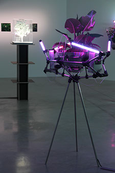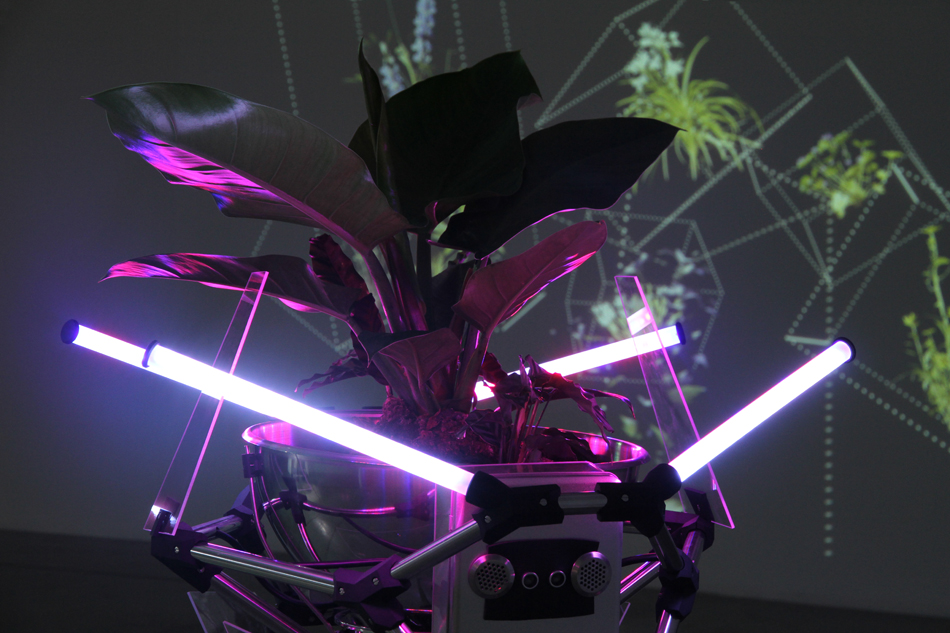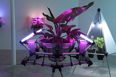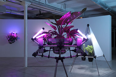 Dispositif interactif sonore et lumineux (comprenant un capteur à ultrasons, des LED programmables et horticoles, deux microcontrôleurs Arduino, deux microordinateurs Raspberry Pi et deux paires d’enceintes), tubes et demi-sphère en inox poli miroir, nœuds imprimés en 3D par frittage de poudre, plaques de PMMA, boîte en aluminium, billes d’argile, terre, végétaux (philodendron, calatheas) - à gauche et au fond à droite : Eco-Fuse, Stroll, Les jardins cybernétiques (court-métrage)