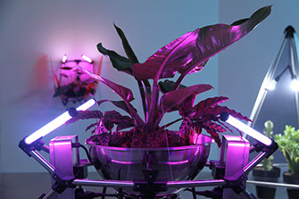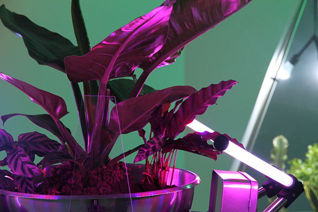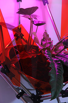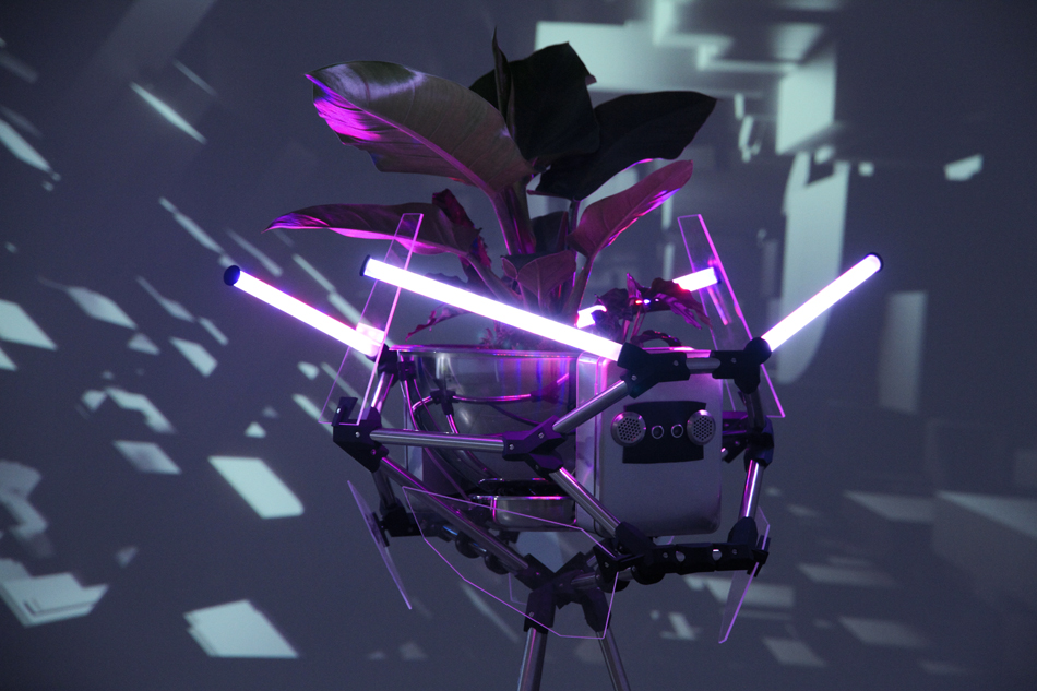 Dispositif interactif sonore et lumineux (comprenant un capteur à ultrasons, des LED programmables et horticoles, deux microcontrôleurs Arduino, deux microordinateurs Raspberry Pi et deux paires d’enceintes), tubes et demi-sphère en inox poli miroir, nœuds imprimés en 3D par frittage de poudre, plaques de PMMA, boîte en aluminium, billes d’argile, terre, végétaux (philodendron, calatheas) - fond : Eco-Fuse