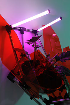 Dispositif interactif sonore et lumineux (comprenant un capteur à ultrasons, des LED programmables et horticoles, deux microcontrôleurs Arduino, deux microordinateurs Raspberry Pi et deux paires d’enceintes), tubes et demi-sphère en inox poli miroir, nœuds imprimés en 3D par frittage de poudre, plaques de PMMA, boîte en aluminium, billes d’argile, terre, végétaux (philodendron, calatheas) - fond : Les jardins cybernétiques (court-métrage)