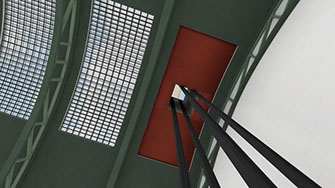Vue depuis la troisième salle, intitulée « Au XIXe, la mécanisation des techniques de capture spatiale » sur la cage d'ascenseur.