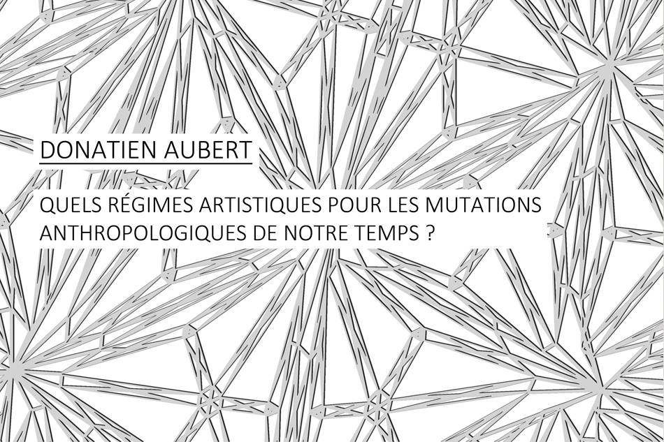 Quels régimes artistiques pour les mutations anthropologiques de notre temps ? est le mémoire écrit par Donatien Aubert pour son Diplôme National Supérieur d’Expression Plastique. Il est illustré d’une centaine d’images et compte 248 pages. Il a été dirigé par Corinne Le Néün.