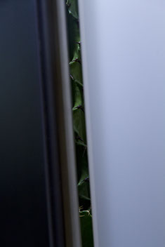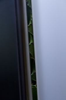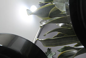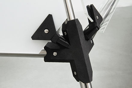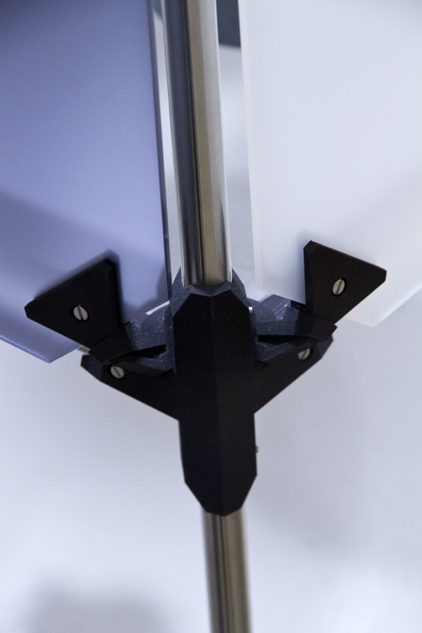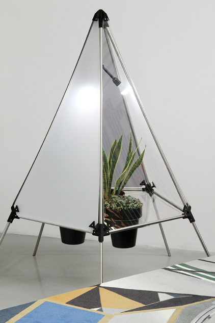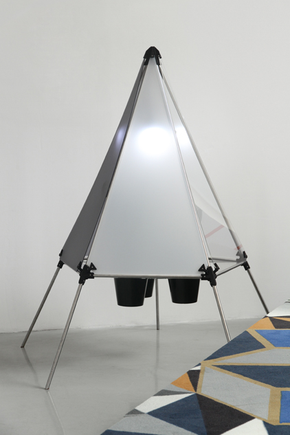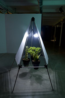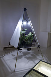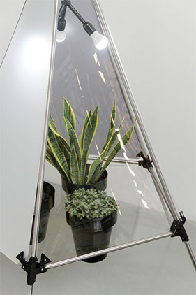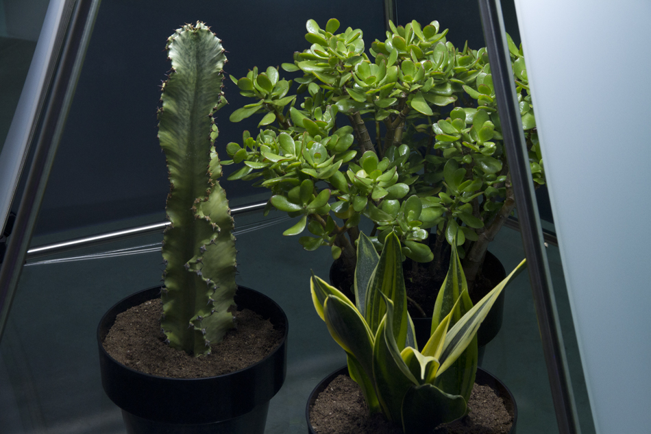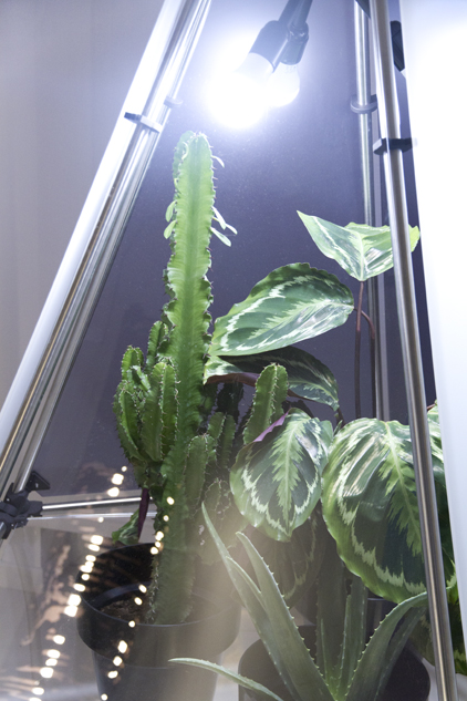 Plaques de PMMA découpées au laser, nœuds imprimés en 3D par frittage de poudre, tubes d’inox polis miroir, ampoules LED blanches, pots en polypropylène noir, aloe vera, euphorbe, calathea