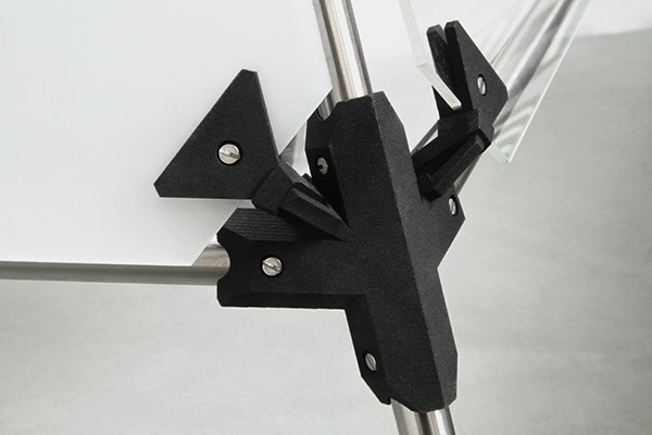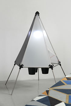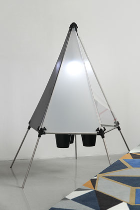 Eco-fuse est une serre adoptant la forme d’une pyramide de section pentagonale, haute de presque deux mètres. Elle est composée de cinq panneaux de plexiglas, mis en tension grâce à des tubes en inox interconnectés par des nœuds en polyamide noir, imprimés en 3D. Elle abrite trois pots en polypropylène où croissent des plantes.