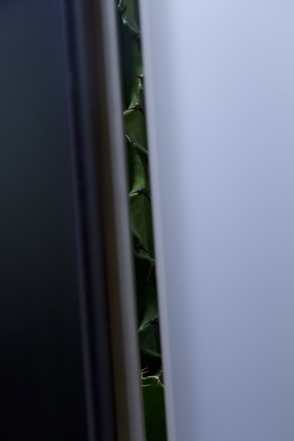 Plaques de PMMA découpées au laser, nœuds imprimés en 3D par frittage de poudre, tubes d’inox polis miroir, ampoules LED blanches, pots en polypropylène noir, agave, euphorbe, crassula