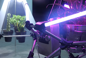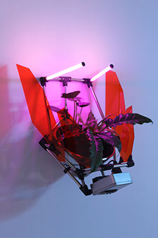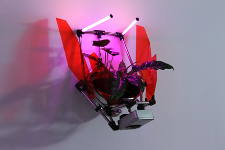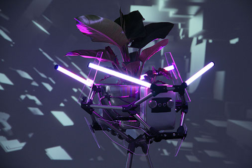 Dispositif interactif sonore et lumineux (comprenant un capteur à ultrasons, des LED programmables et horticoles, deux microcontrôleurs Arduino, deux microordinateurs Raspberry Pi et deux paires d’enceintes), tubes et demi-sphère en inox poli miroir, nœuds imprimés en 3D par frittage de poudre, plaques de PMMA, boîte en aluminium, billes d’argile, terre, végétaux (philodendron, calatheas) - fond : Les jardins cybernétiques (court-métrage)