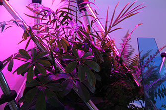 Dispositif interactif sonore et lumineux (comprenant un capteur à ultrasons, des LED programmables et horticoles, un microcontrôleur Arduino, un microordinateur Raspberry Pi et une paire d’enceintes), tubes et demi-sphère en inox poli miroir, nœuds imprimés en 3D par frittage de poudre, plaques de PMMA, boîte en aluminium, billes d’argile, terre, végétaux (adiantum, nephrolepsis, schefflera, chamedorea)