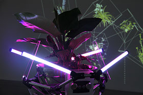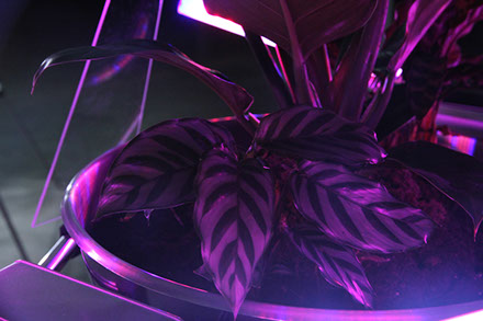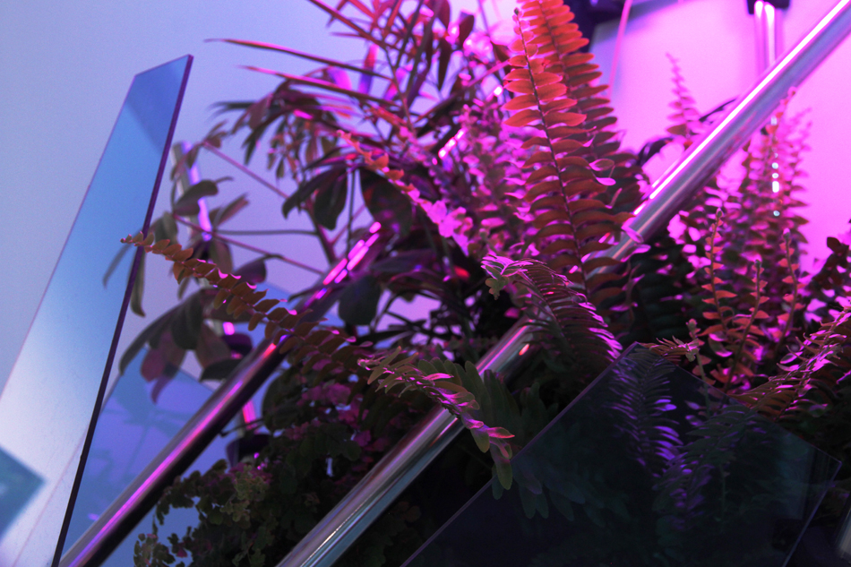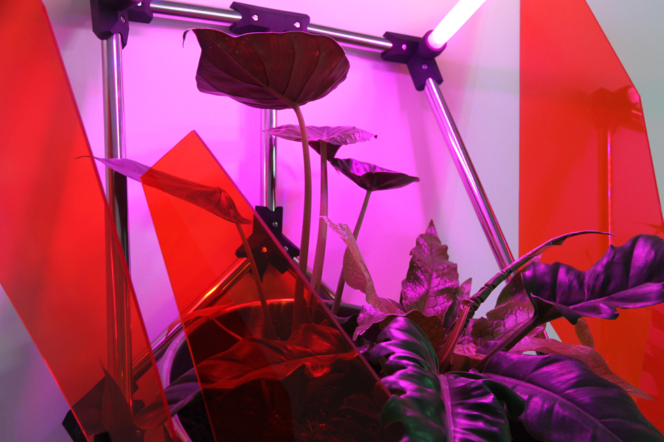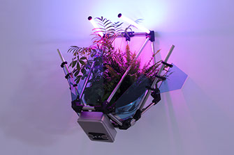 Dispositif interactif sonore et lumineux (comprenant un capteur à ultrasons, des LED programmables et horticoles, deux microcontrôleurs Arduino, deux microordinateurs Raspberry Pi et deux paires d’enceintes), tubes et demi-sphère en inox poli miroir, nœuds imprimés en 3D par frittage de poudre, plaques de PMMA, boîte en aluminium, billes d’argile, terre, végétaux (philodendron, calatheas) - fond : Eco-Fuse