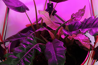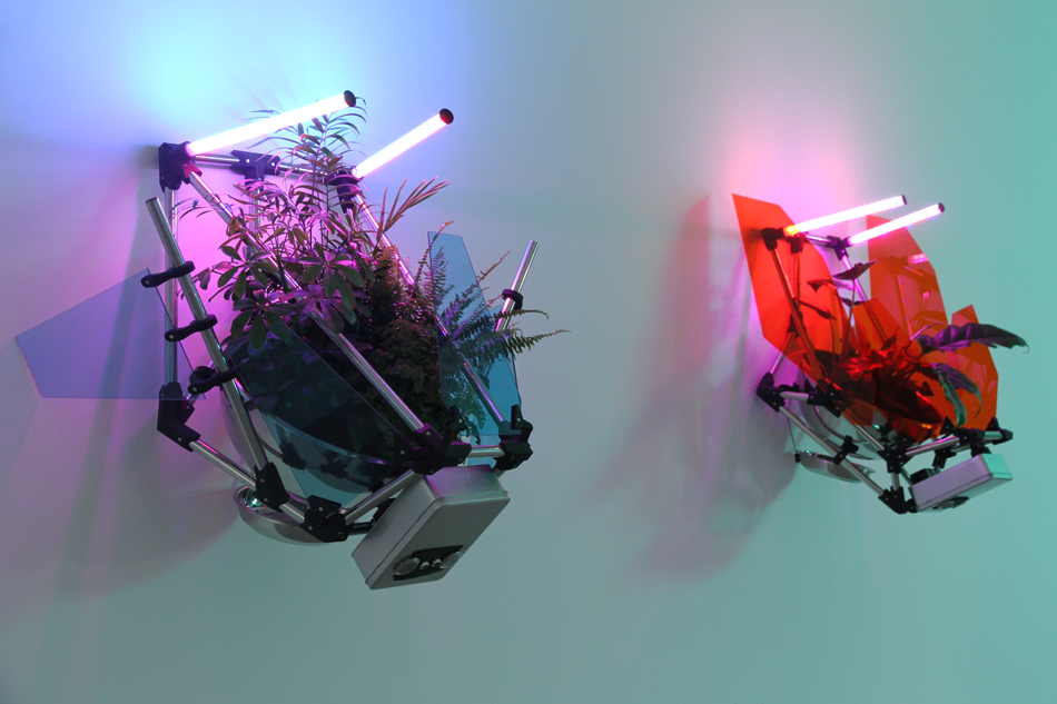 Dispositif interactif sonore et lumineux (comprenant un capteur à ultrasons, des LED programmables et horticoles, deux microcontrôleurs Arduino, deux microordinateurs Raspberry Pi et deux paires d’enceintes), tubes et demi-sphère en inox poli miroir, nœuds imprimés en 3D par frittage de poudre, plaques de PMMA, boîte en aluminium, billes d’argile, terre, végétaux (philodendron, calatheas) - fond, de gauche à droite : Chrysalide no2, Eco-Fuse