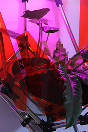 Dispositif interactif sonore et lumineux (comprenant un capteur à ultrasons, des LED programmables et horticoles, deux microcontrôleurs Arduino, deux microordinateurs Raspberry Pi et deux paires d’enceintes), tubes et demi-sphère en inox poli miroir, nœuds imprimés en 3D par frittage de poudre, plaques de PMMA, boîte en aluminium, billes d’argile, terre, végétaux (philodendron, calatheas) - fond : série Disparues et Chrysalide no1