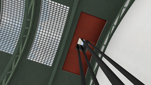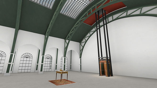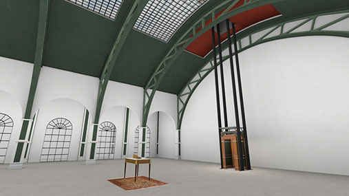 Un ascenseur apparaît lorsque l'interactant s'avance au bout de la salle, lui permettant d'accéder à la suite du parcours.