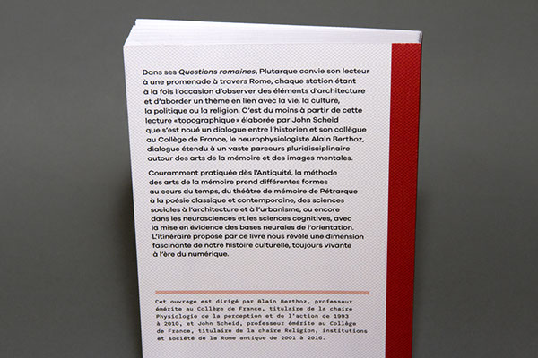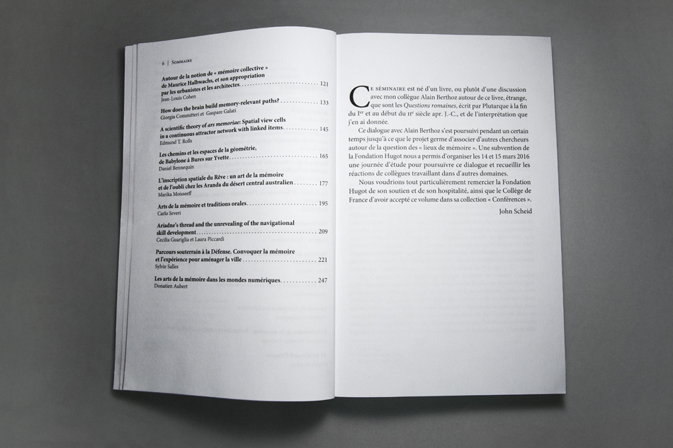 C’est du moins à partir de cette lecture « topographique » élaborée par John Scheid que s’est noué un dialogue entre l’historien et son collègue, le biologiste Alain Berthoz, dialogue étendu à un vaste parcours pluridisciplinaire autour des arts de la mémoire et des images mentales.