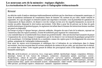 Mots-clés : art de la mémoire ; ars memoriae ; locus ; imago agens ; kabbale ; épistémologie ; logique ; computation ; littérature ; sémiologie ; histoire de l’art ; histoire des techniques ; architecture ; sémantisation spatiale ; muséologie ; studiolo ; Wunderkammer ; cabinet de curiosités ; paradigme perspectif ; costruzione legittima ; infographie tridimensionnelle ; modélisation 3D ; image de synthèse ; remédiation ; cybernétique ; intelligence artificielle ; humanités numériques ; interaction homme-machine (ihm) ; agents conversationnels incarnés ; transhumanisme ; réalité virtuelle ; réalité augmentée ; jeu vidéo ; effets spéciaux ; psychologie cognitive ; réminiscence ; anamnèse ; engrammes cérébraux.